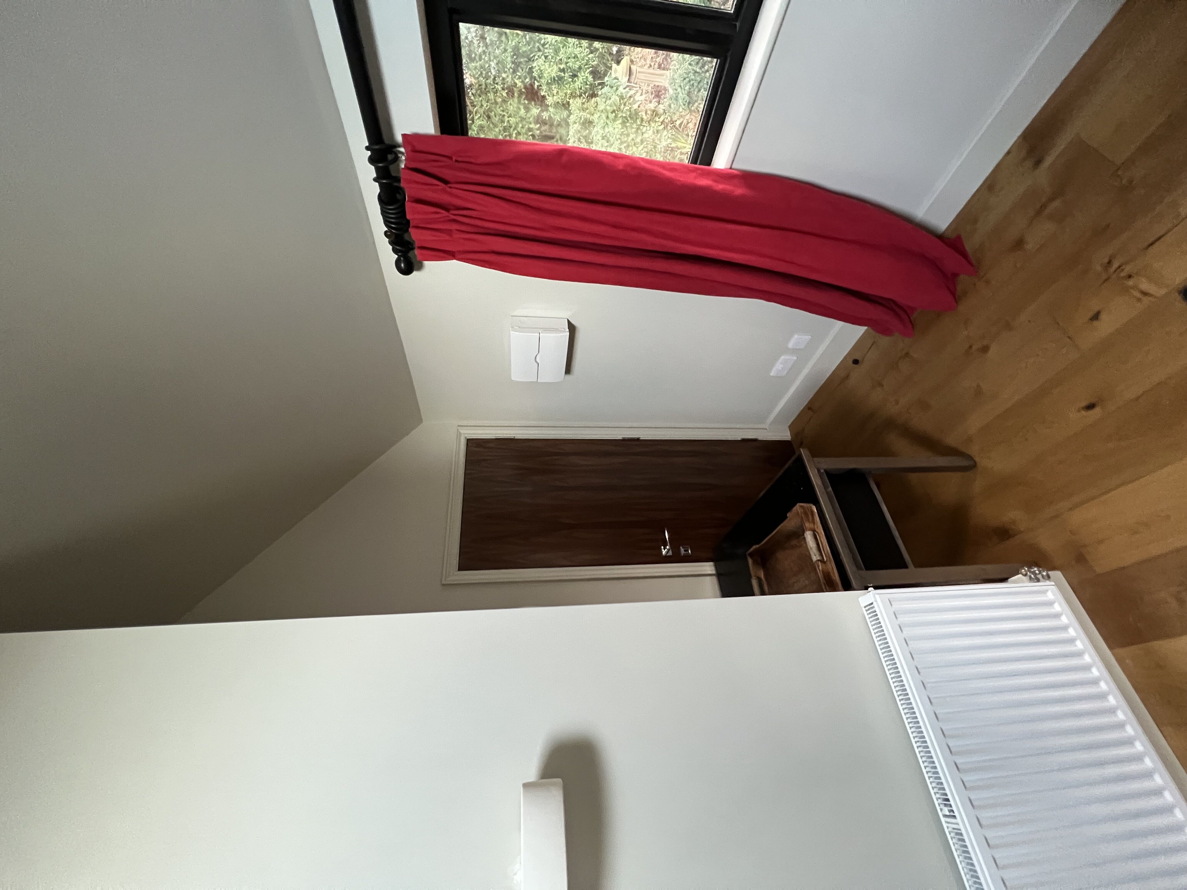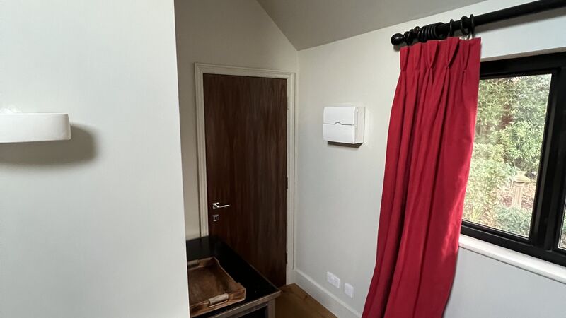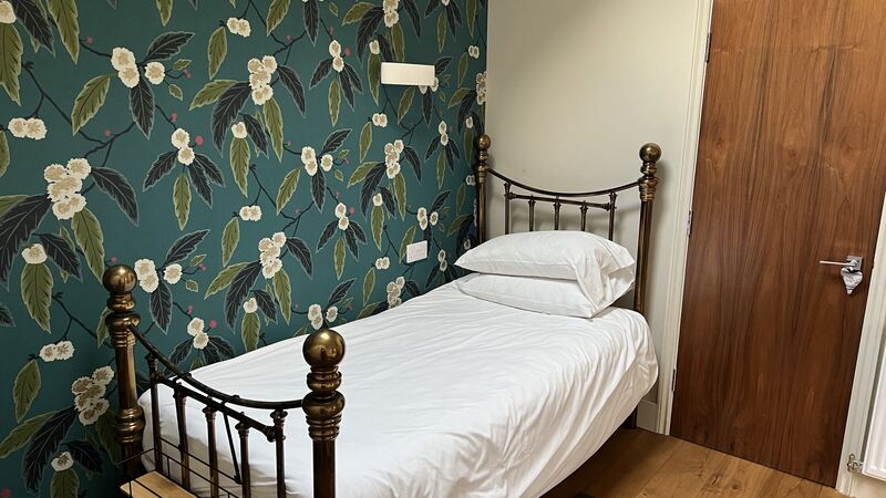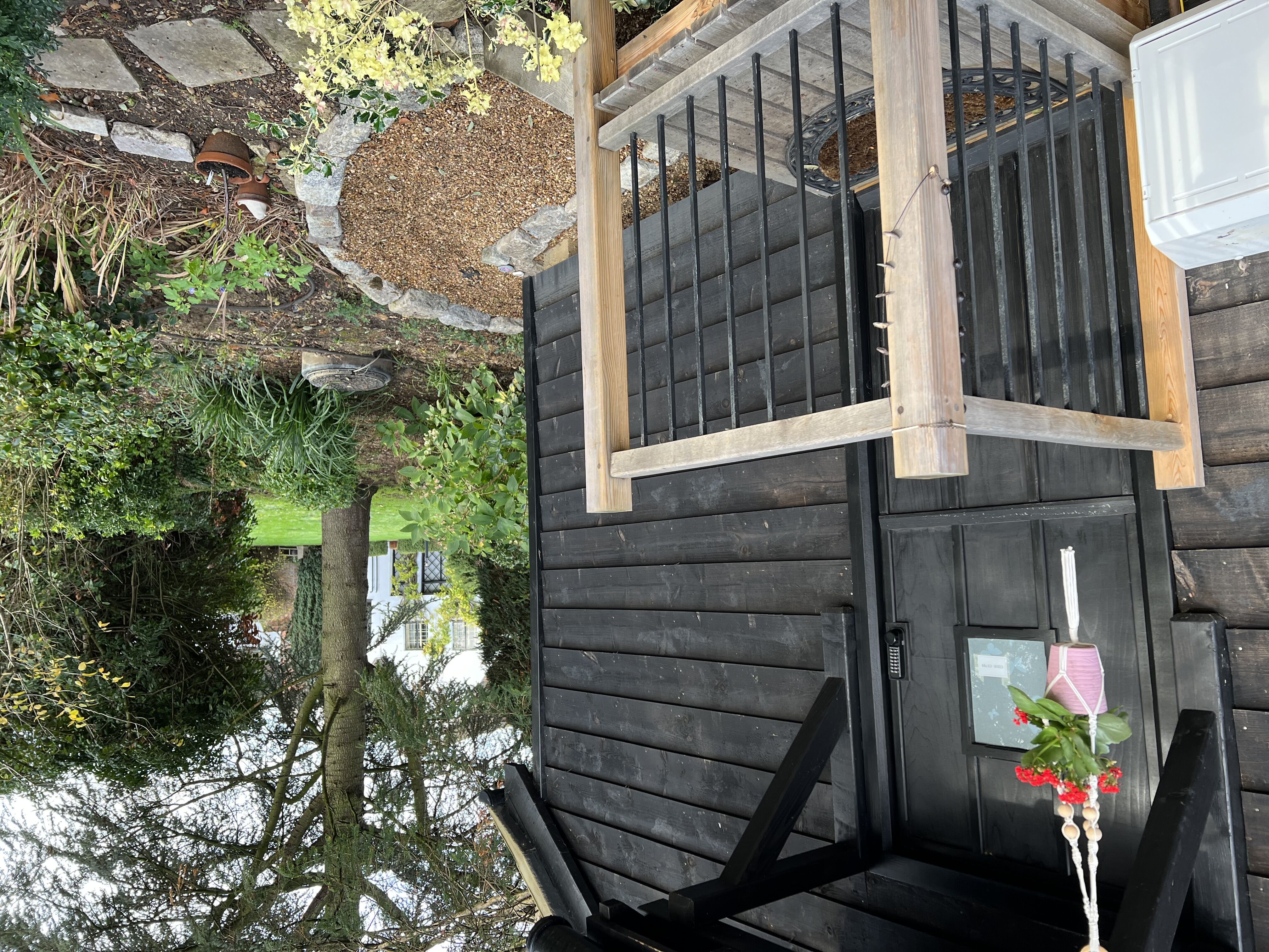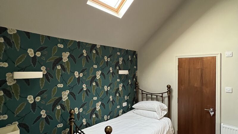 Views can be had from the doorway over open countryside. The window allows views over the garden and the wooded area adjacent to the room. There is a paved seating area adjacent to the room. The room has a brass bed with a high-quality mattress. It has a shower room, central heating, Wi-Fi and a hanging rail.